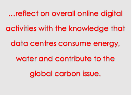 As you have read through this list, you might reflect on overall online digital activities with the knowledge that data centres consume energy, water, and contribute to the global carbon issue. Consider raising awareness of this issue with your students and peers as well.